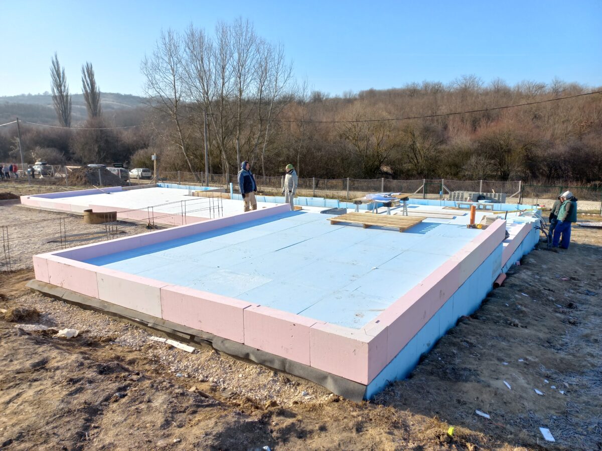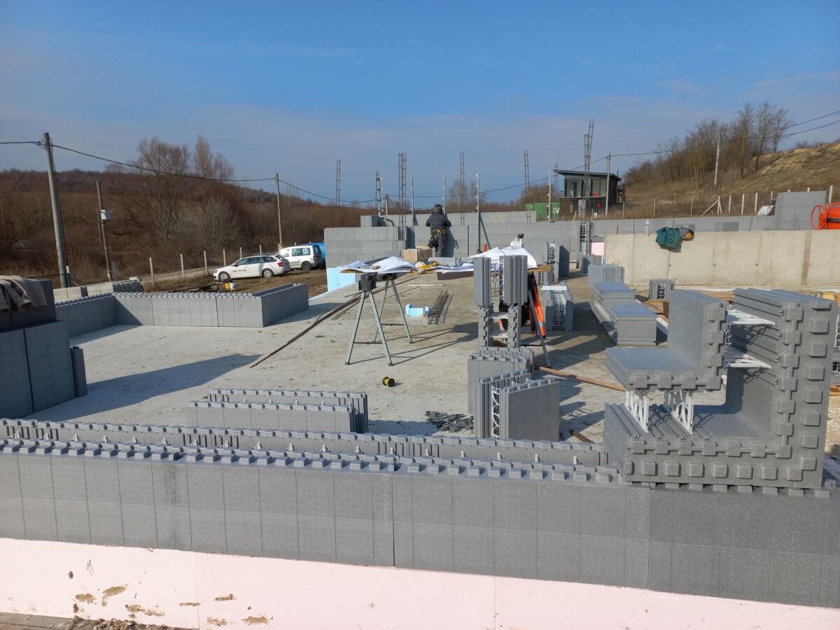 Blizu Budimpešte smo s kolegi iz JUB Kft dobavili in pomagali naročniku postaviti prvo JUBHome ICF hišo. Temeljna plošča je izolirana z JUBHome BASE 300 8+8 cm, stene so kombinacija JUBHome WALL 300 in 390 debeline. Objekt je atrijska hiša s koto pritličja v dveh višinah. Debelina fasade se po dolžini in po višini objekta večkrat spremeni tako, da je objekt rekorden po številu namensko oblikovanih sestavnih kosov. Izdelava posebno oblikovanih kosov za stene z namenom, da na objektu ni rezanja in odpadkov je naša konkurenčna prednost in smo s takim načinom priprave ICF elementov eni redkih Evropi.