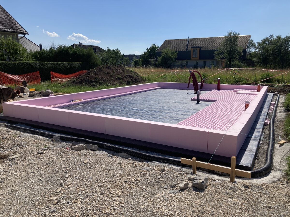Na Gorenjskem so sestavili JUBHome BASE  toplotno izolacijsko kad, debeline 16 cm v katero bodo zalili armirano betonsko temeljno ploščo montažne hiše. Nosilne stene so previdene iz lesenih KLH plošč, fasadna toplotna izolacija, lepila in podzidki pa bodo spet iz JUBovih materialov.