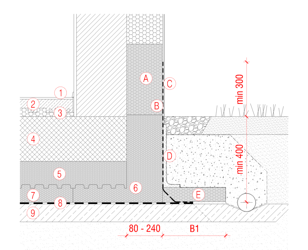 Robni element toplotne izolacije temeljne plošče JUBHOME BASE preide brez toplotnega mostu neposredno v fasadni del stenskega elementa JUBHome WALL ter tako zagotavlja zvezni toplotnoizolacijski ovoj. Talna hidroizolacija je iz varjenih bitumenskih trakov in je spojena z varjeno ali samolepilno vertikalno izolacijo podzidka.